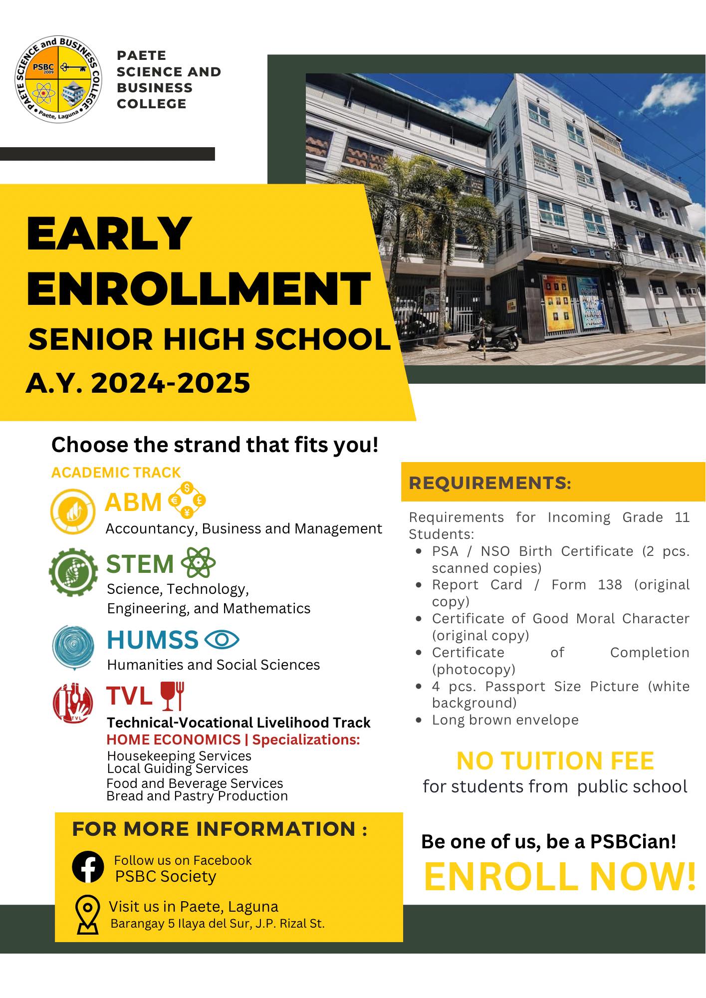PSBC Senior High School is now accepting early applicants for the A.Y. 2024 - 2025. For enrollment: Visit SHS Office Monday - Friday 8:00 am - 4:00 pm Requirements: •PSA/NSO (scanned copy) •Long brown envelope Join PSBC and be part of our growing family! 🦅